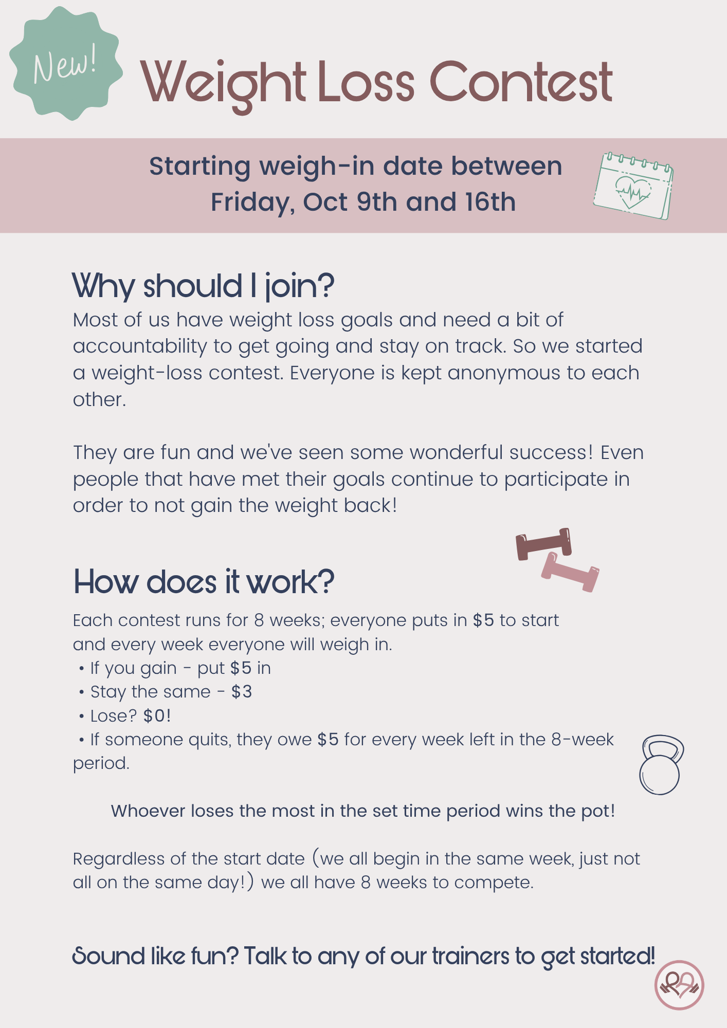 Back to All Events Weight Loss Contest Friday, October 9, 2026 10:00 AM Friday, October 16, 2026 8:00 PM Park Avenue Fitness 2505 Cabrillo College Drive Aptos, CA, 95003 United States (map) Google Calendar ICS